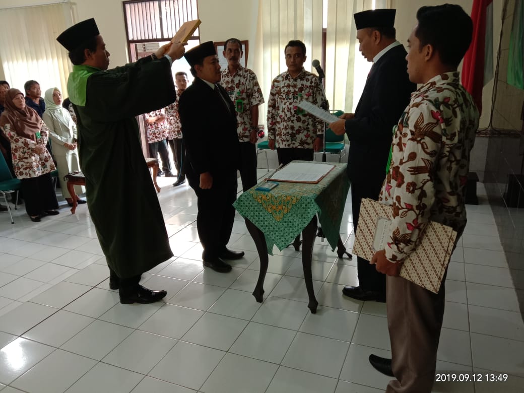 KAJEN – Sebagai seorang pegawai, sudah selayaknya menjalankan tugasnya dengan penuh dedikasi. Dengan mengutamakan kepentingan Negara di atas kepentingan pribadi maupun golongan. Sesuai dengan sumpah jabatan yang telah diucapkan saat pelantikan. Hal ini ditegaskan Ketua Pengadilan Agama Kajen Kelas I.B Bapak Drs. H. Suwoto, S.H., M.H., saat melantik Eko Sambudhi, S.T. sebagai Kepala Sub Bagian Umum dan Keuangan Pengadilan Agama Kajen Kelas I.B.